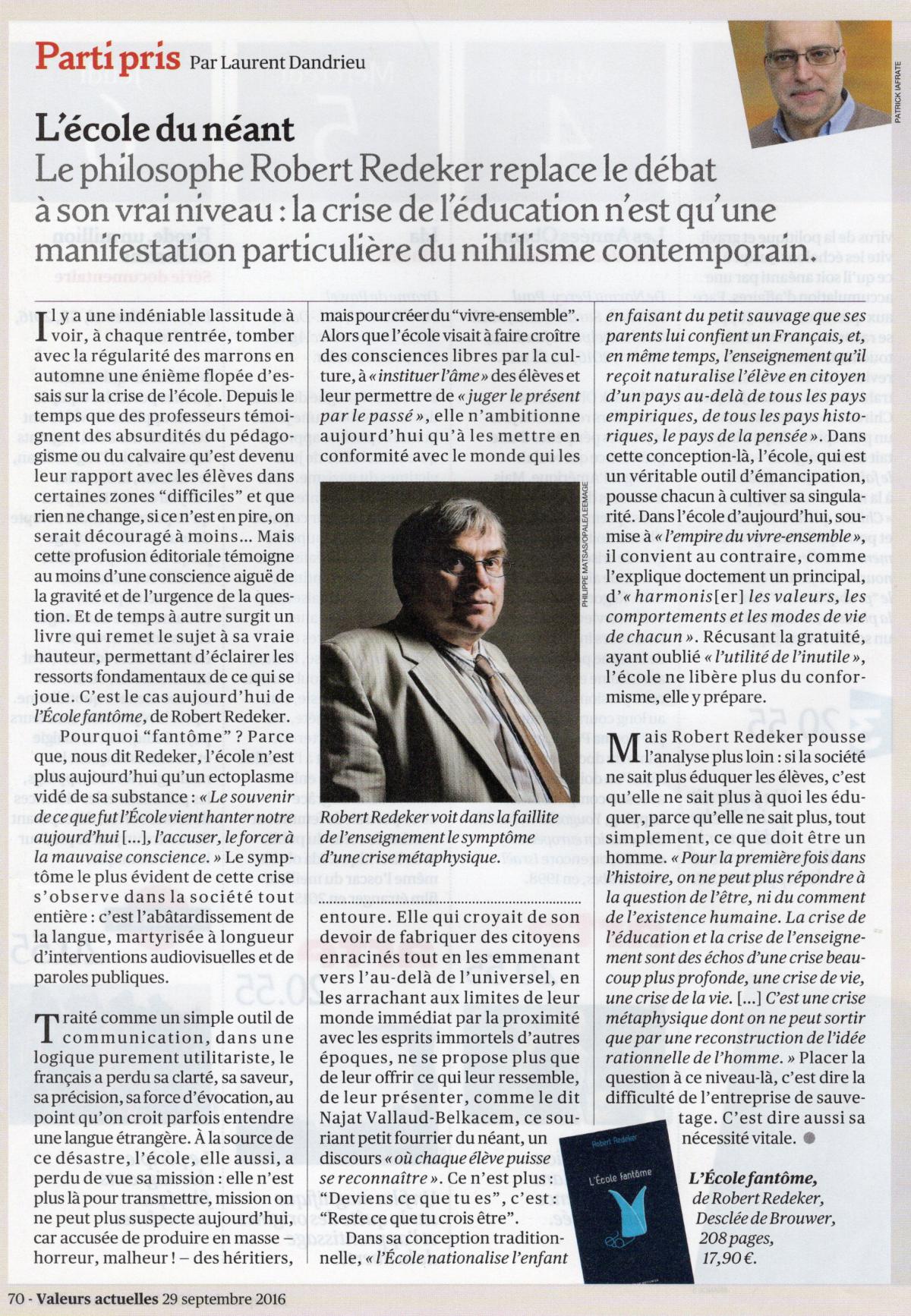 Sur L'Ecole fantôme, le livre de Robert Redeker, par Laurent Dandrieu. Publié dans Valeurs Actuelles, le 29 septembre 2016.