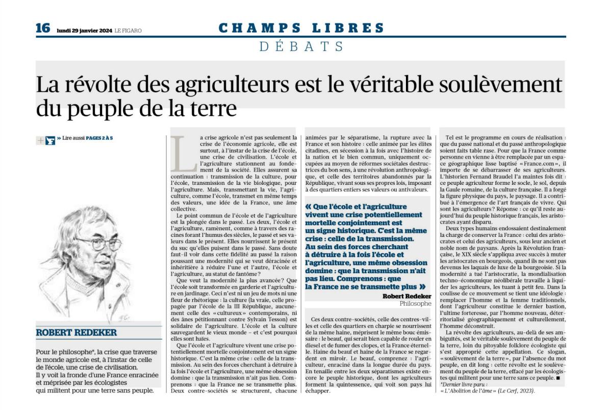 La révolte des agriculteurs, au-delà, de ses ambiguïtés, est le véritable soulèvement du peuple de la terre, loin du pitoyable folklore écologiste qui s’est approprié cette appellation. Ce slogan, « soulèvement de la terre », par l’absence du mot peuple, en dit long : cette révolte est le soulèvement du peuple de la terre, effacé par les écologistes qui militent pour une terre sans ce peuple.